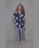 - בדים אלסטים וקלילים בדוגמת כתמים בהירים על רקע כחול נייבי בתוספת בד בדוגמת פסים דקים