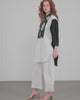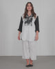- שילוב אריגי ויסקוזה קלילים בצבעי שחור ולבן עם דוגמת פסי סיכה, וליבית סאטן שחורה בהדפס פרחים לבנים היוצר מראה קונטרסטי ומעניין