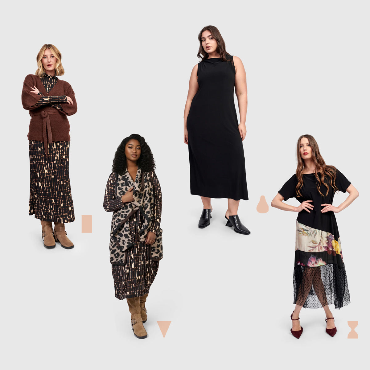 כתפיים, מותניים וירכיים ברוחב דומה, קו ישר. מה עשוי להוסיף רכות? יצירת תחושת מותן עם שכבות שמוסיפות נפח, מעילים מחויטים בגזרה ברורה, חגורות שמייצרות קו אמצע נשי, בדים נשפכים עם תנועה שמוסיפה עניין.